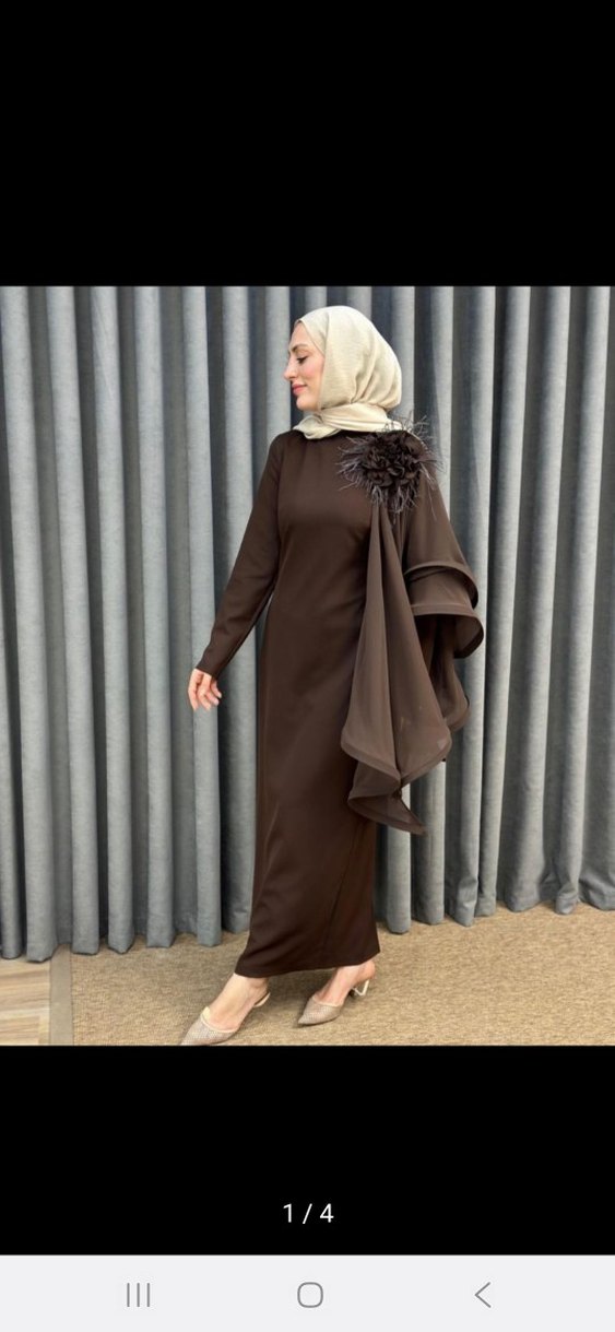Uzun kahverengi elbise, yüksek yaka ve uzun kollu tasarıma sahip. Drapeli detayları ve etnik desenleriyle sade ve modern bir görünüm sunar. Günlük kullanıma uygun.