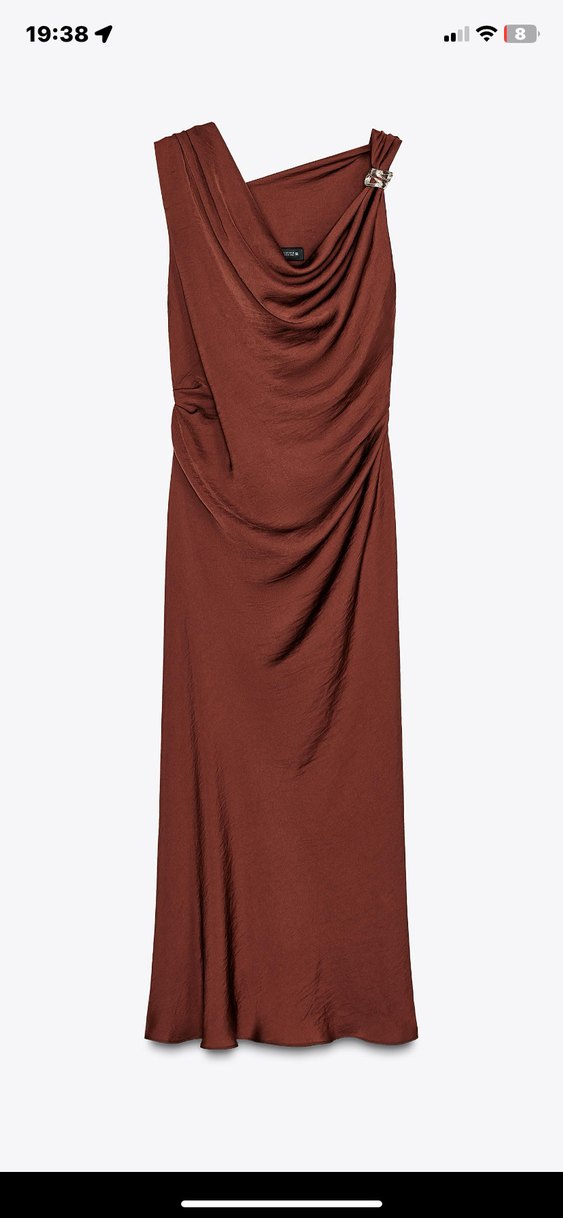 Drapeli, kayık yaka ve kolsuz uzun elbise, yumuşak ve parlak kahverengi kumaştan, bol kesim ve minimalist tarzda, romantik akşamlar için uygun.