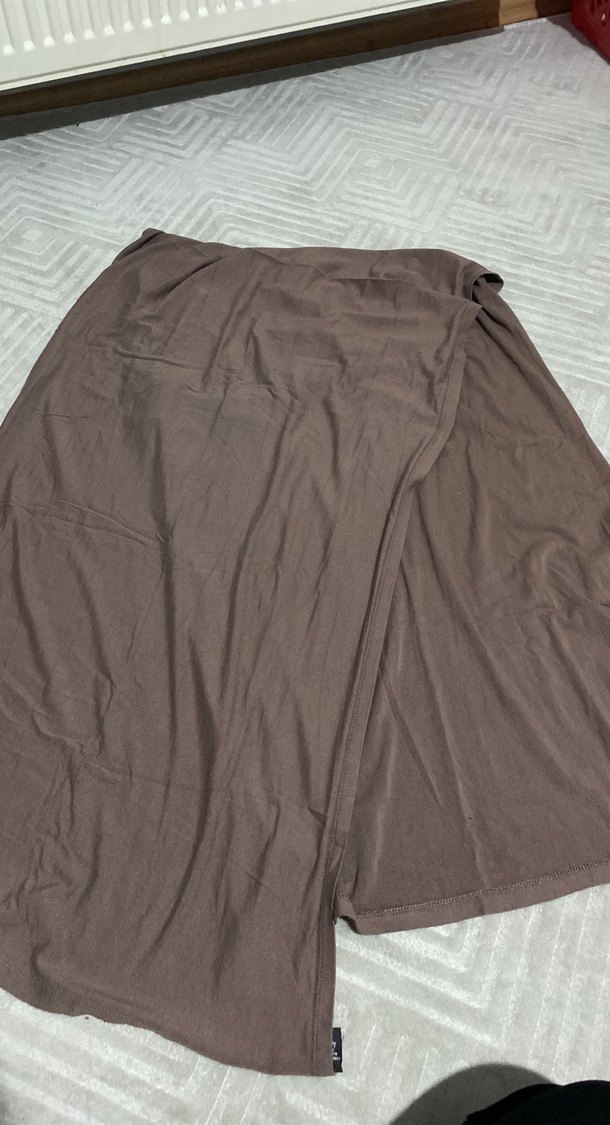 Drapeli ve bol kesim uzun kahverengi penye şal yumuşak kumaştan yapılmıştır ve günlük kullanım için uygundur.