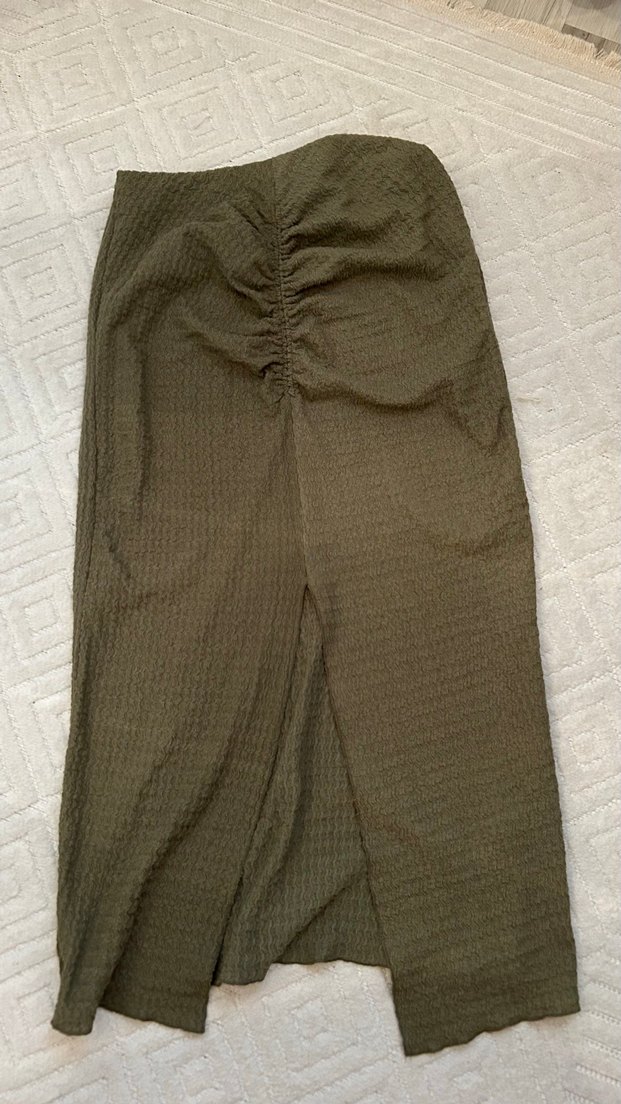 Haki renkli, keten kumaştan yapılmış, drapeli ve bol kesim uzun etek. Parlak dokusu günlük kullanım için uygun şıklık sunar. Her iki etekde çok güzel duruyor tertemiz defosuz 40 bedene kadar olur koyu olan hm etiket kesik