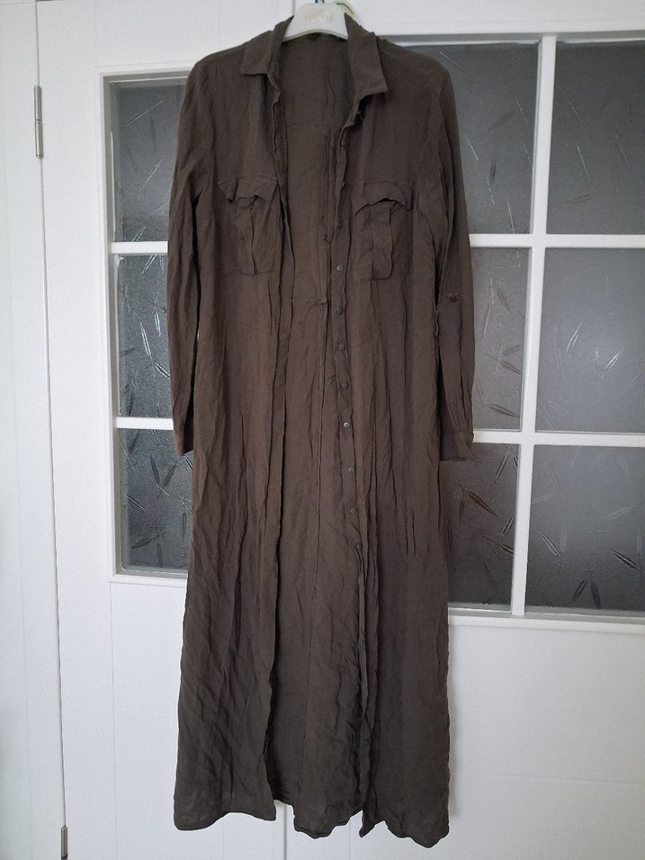 Kahverengi uzun keten tunik,bol kesim ve drapeli detaylara sahiptir. Uzun kollu, yakalı ve gündelik bohem tarzda bir üründür. ürün ütüsüzdür resimlerde