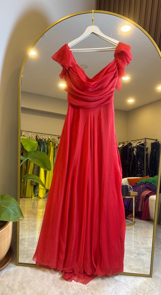 Drapeli Uzun Kırmızı Kadın Abiye Elbise