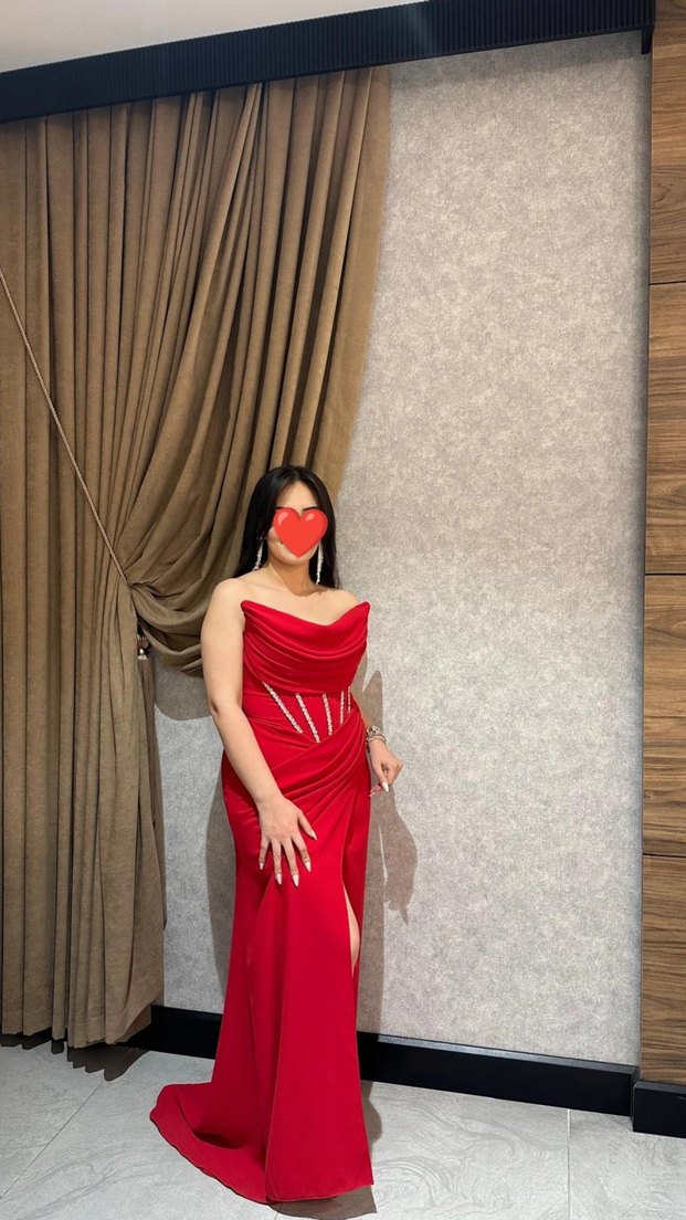Drapeli Uzun Kırmızı Straplez Abiye Elbise