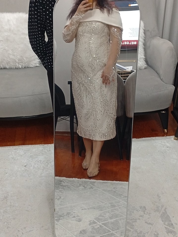 Beyaz midi uzun kollu, drapeli ve straplez yaka detaylı, modern klasik tarzda, normal kesim nişan elbisesi. kabsizdir kendi dikimim benim kilom 83 boyum 175 boy ayarlamaya yardımcı olurum detay sorabilirsiniz✨