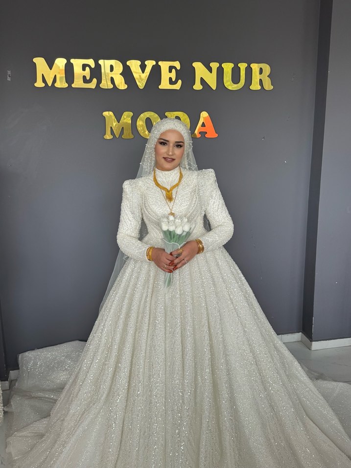 Drapeli, etnik desenli, uzun kollu ve tekne yaka, beyaz renkli, modest ve gösterişli kesim gelinlik.