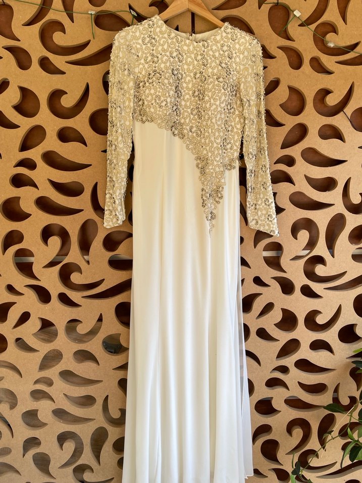 Drapeli Uzun Kollu Beyaz Vintage Abiye Nişanlık Gelinlik