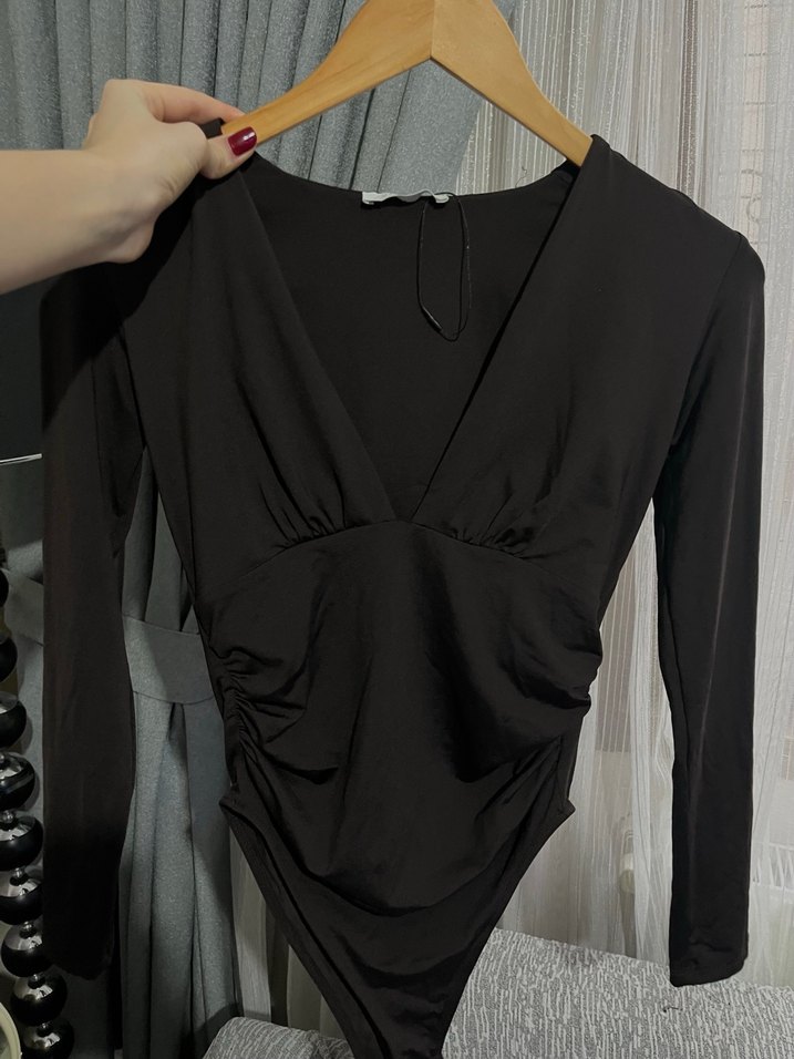 V yaka ve uzun kollu, koyu kahve ve vücuda oturan bluz, yeni aldım etiketin ipi bile takılı beyaz etiket zara-M Beden-