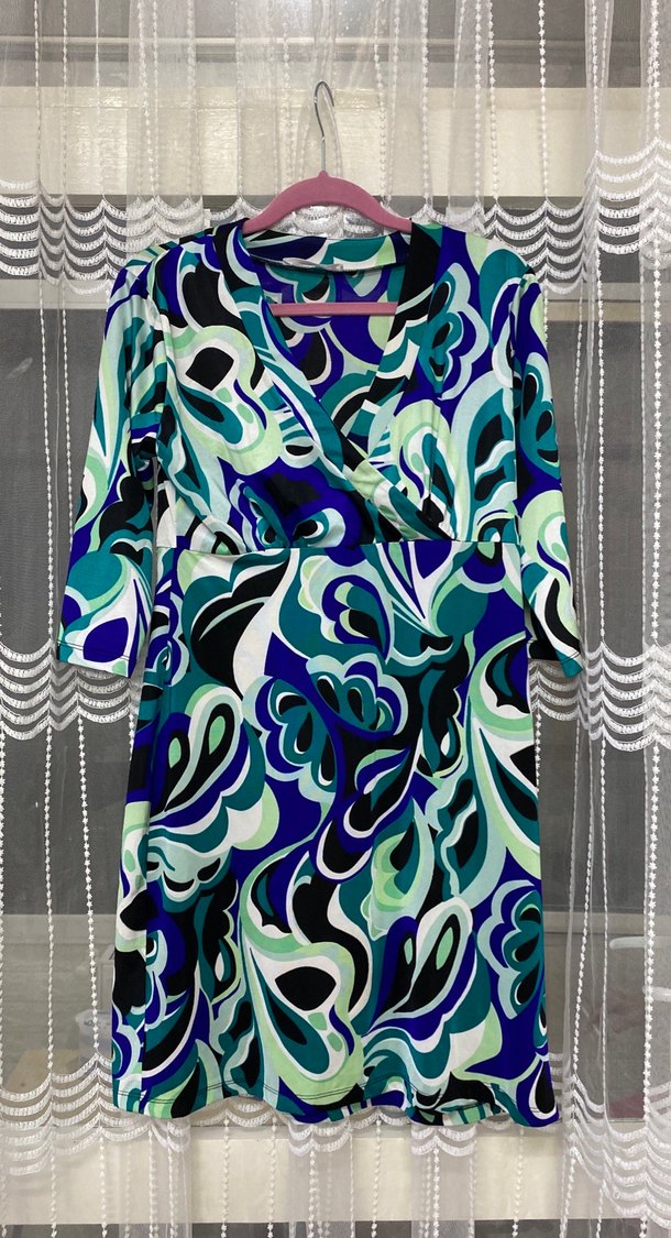 Siyah, mavi ve yeşil tonlarında çok renkli, drapeli, V yaka ve uzun kollu anne elbise. Sentetik kumaştan, bohem tarzda, günlük kullanım için uygundur.