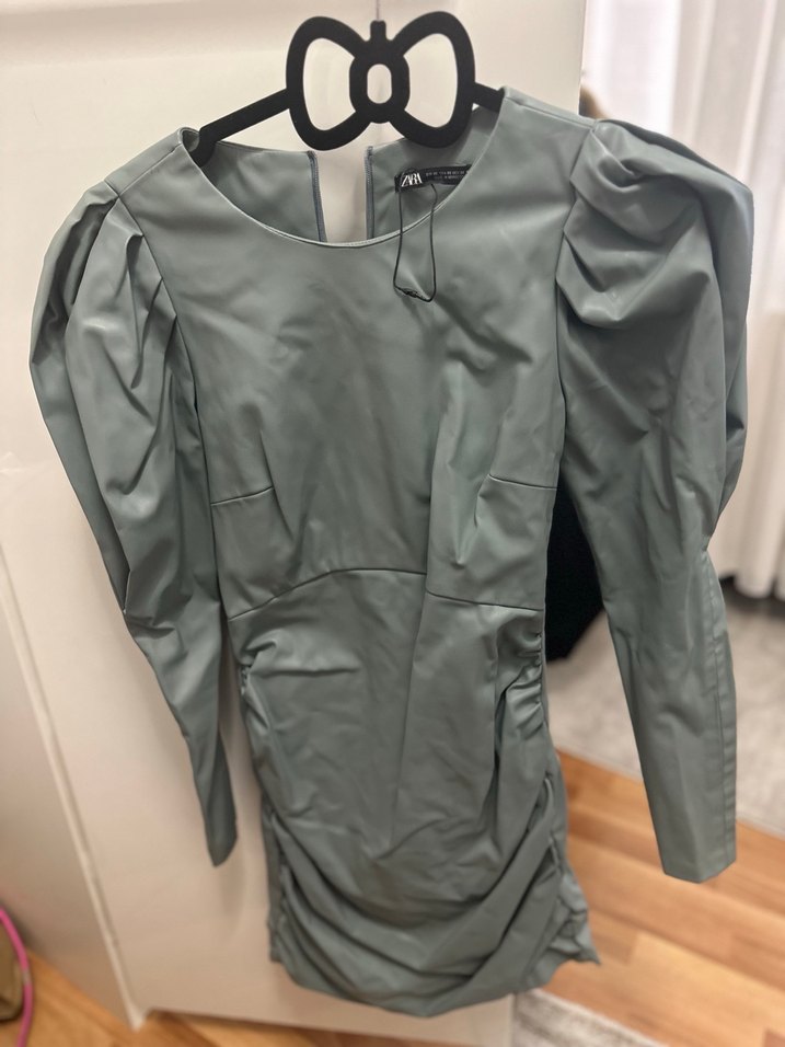 Drapeli Uzun Kollu deri Midi Elbise