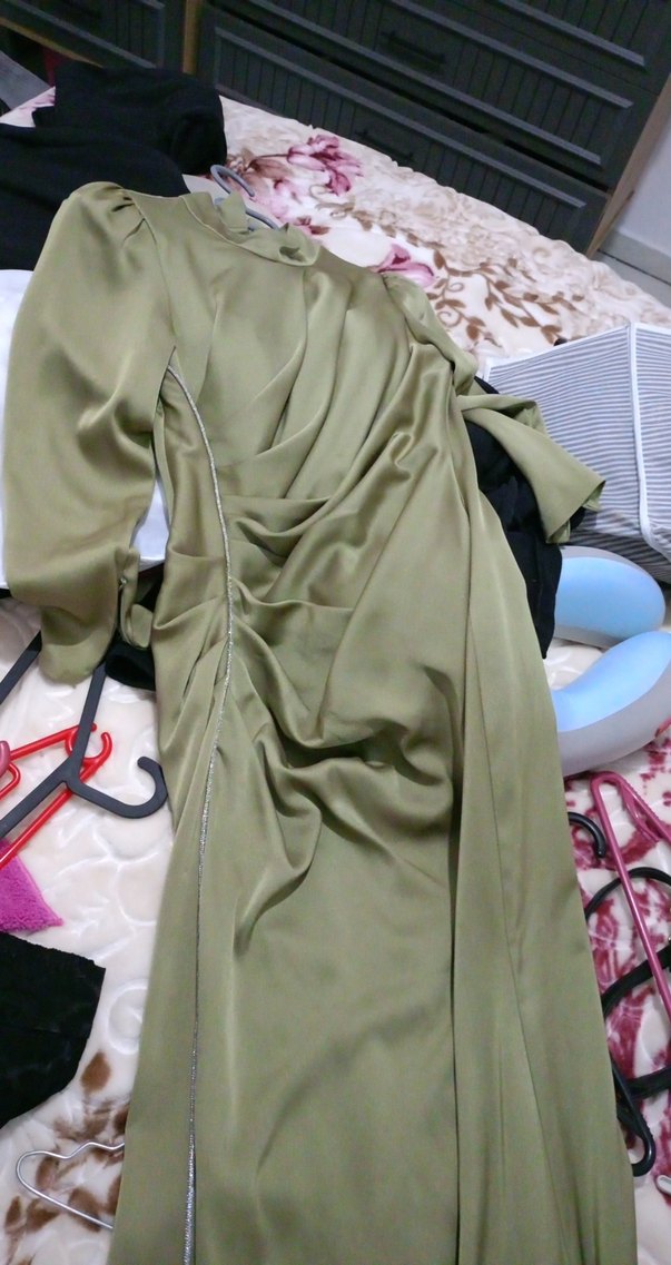 Drapeli detaylara ve yüksek yakaya sahip, haki renkli, uzun kollu, vücuda oturan uzun elbise. Yumuşak sentetik kumaştan, günlük kullanıma uygun.