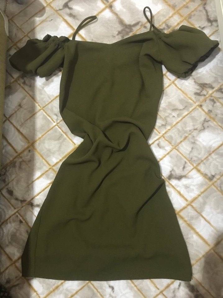 Haki renkli uzun elbise, drapeli tasarımı, kısa kollu ve straplez yakası ile dikkat çeker. Parlak sentetik kumaştan, bol kesim ve günlük kullanım için uygundur.