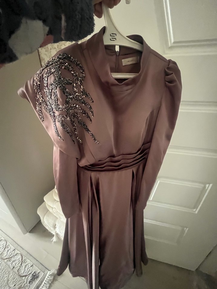 Kahverengi, uzun kollu ve drapeli bu abiye elbise, nakış detayları ve geniş kesimiyle düğünler için uygundur.