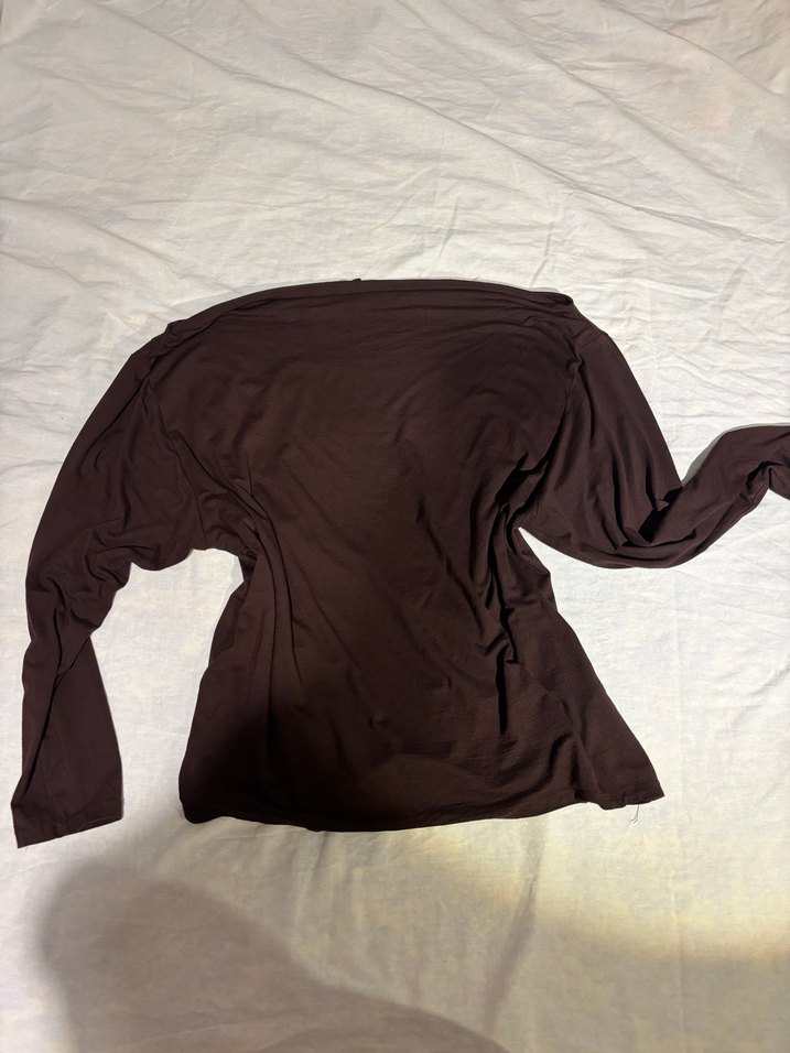 Kahverengi keten kumaştan, drapeli, uzun kollu ve kayık yaka kadın bluz. Bol kesim ve normal boyda, minimalist tarzda günlük sokak kullanımı için uygun.