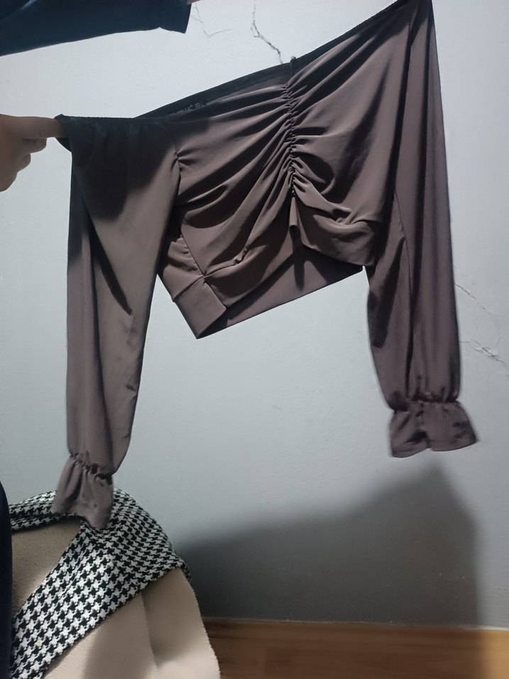 Kahverengi, uzun kollu ve manşetleri büzgülü kadın bluz. Drapeli ve vücuda oturan kesimiyle, tek renk ve midi boyda. Tekstil sentetik ve günlük sokak stili için uygun.