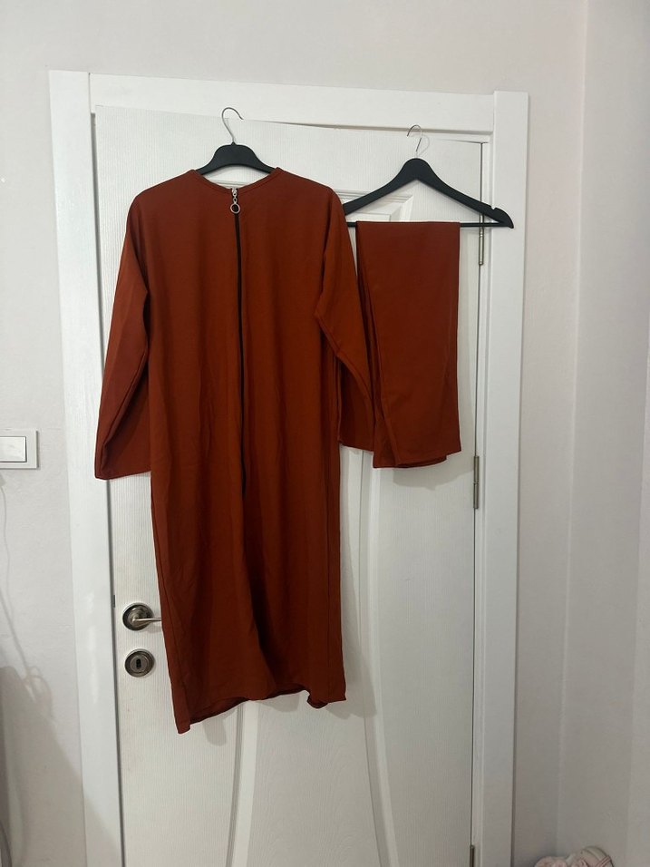 Drapeli tasarıma sahip, uzun kollu ve regular fit kahverengi kadın takımı. Sentetik kumaştan, günlük kullanıma uygundur.
