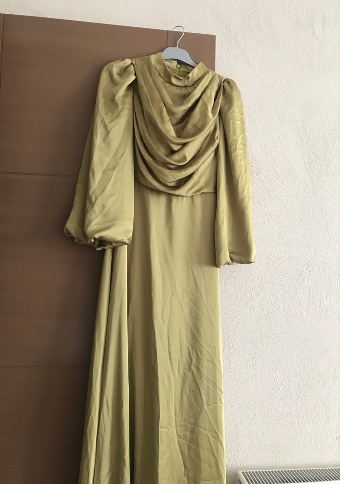 Keten kumaştan, drapeli yüksek yakalı ve uzun kollu, bol kesimli parlak kumaşlı khaki uzun elbise. Modern klasik ve vintage tarzı için uygundur. Kapalıydım yeni açıldım o yuzden satıyorum