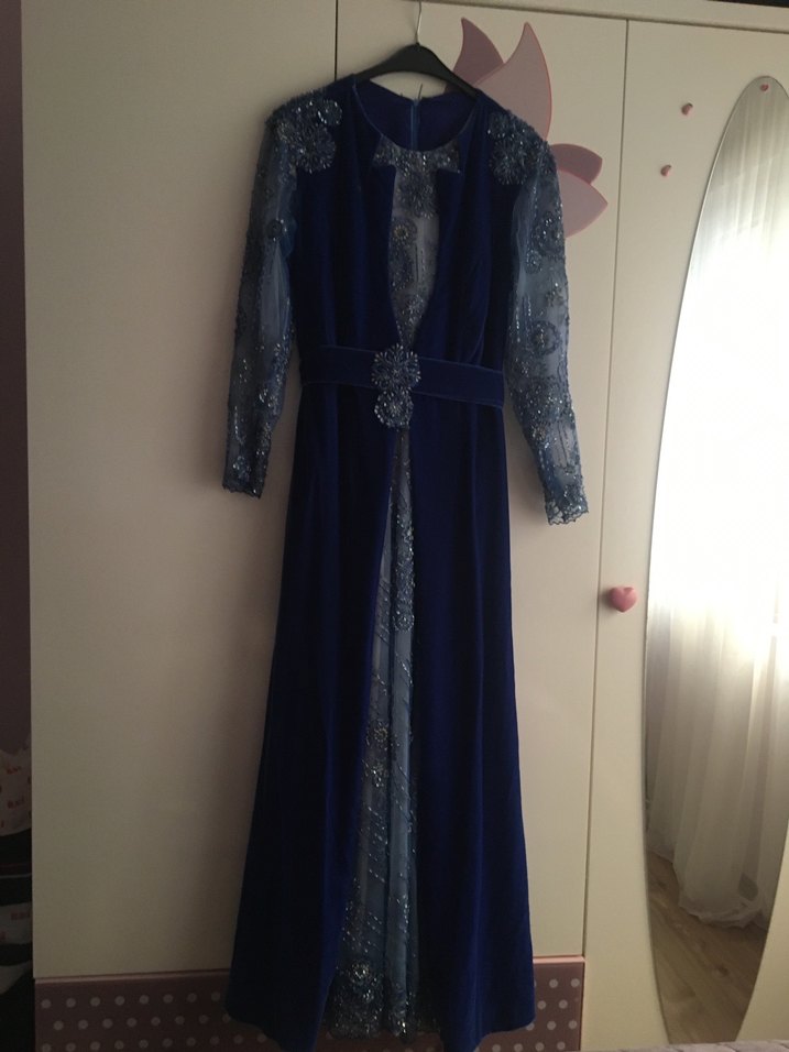 Bu dar kesim uzun abiye elbise, drapeli tasarımı ve detaylı nakışlarıyla lacivert rengindedir. Uzun kollu ve kesimli yakalıdır, düğünler için vintage dokunuş sunar.