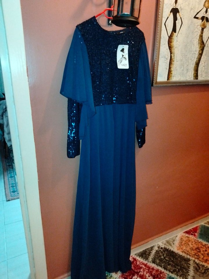Lacivert, uzun boylu, bol kesim drapeli abiye elbise. Uzun kollu, yuvarlak yaka ve baskılı, gösterişli tarzda düğünlere uygun. ✨