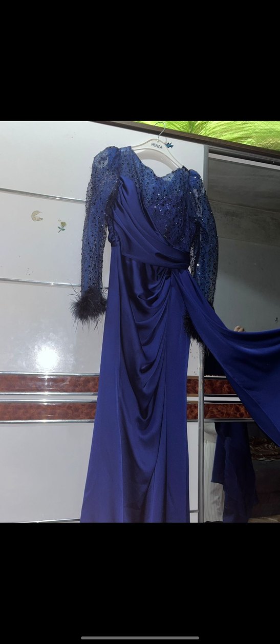 Drapeli ve desenli uzun kollu, fitted kesim mavi abiye elbise. Modern klasik tarzda, düğün için şık ve göz alıcı bir seçim. ✨