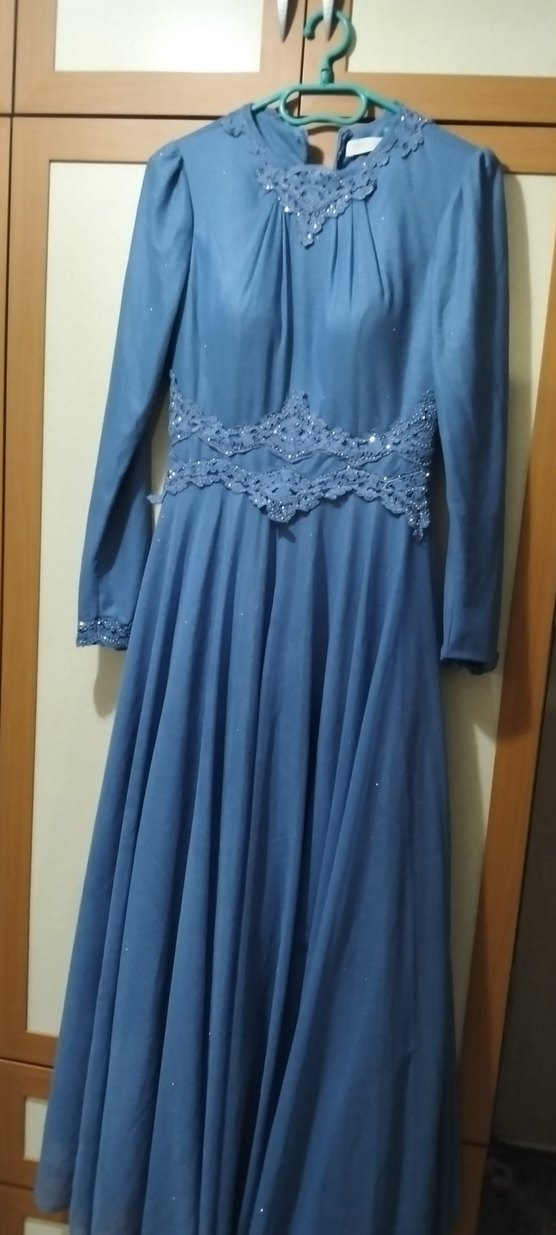 Drapeli Uzun Kollu Mavi Abiye Elbise