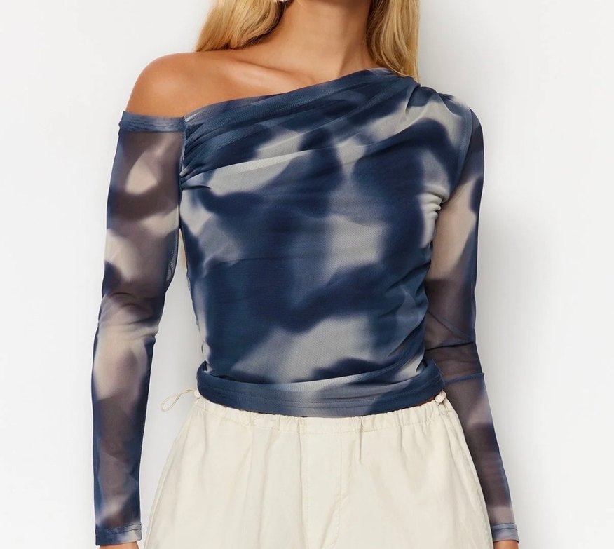 Drapeli Uzun Kollu Mavi Batik Bluz