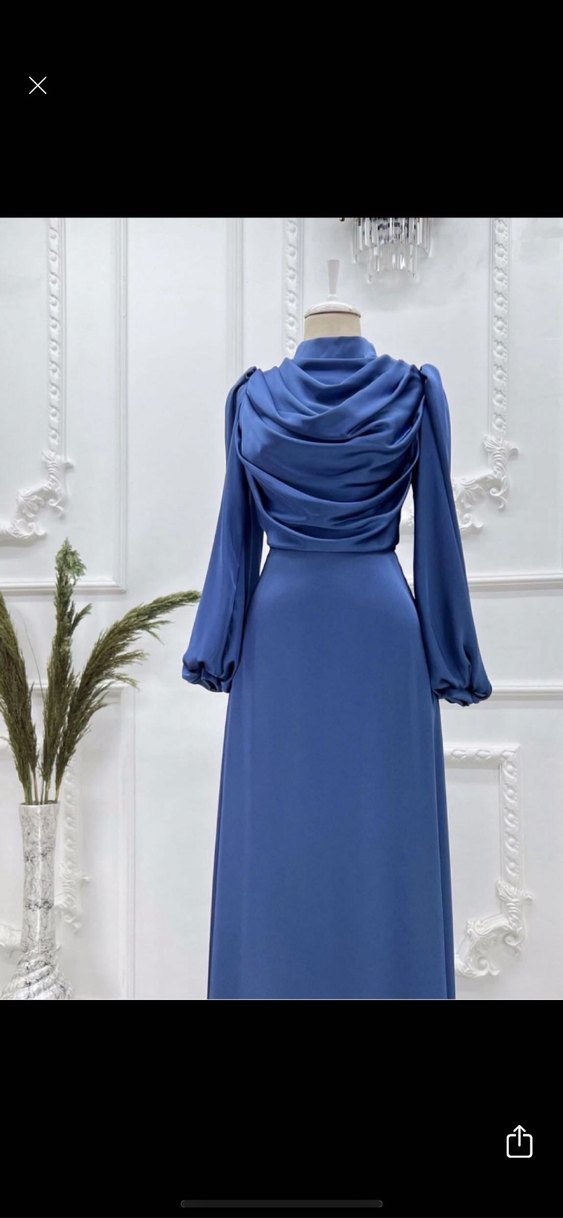 Yüksek yakalı, drapeli uzun kollu mavi gece elbisesi, parlak ve desensiz. Klasik şıklık için ideal, normal kesim.