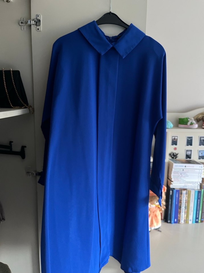 Drapeli uzun ve bol kesim mavi tunik, yakalı ve uzun kollu. İpeksi kumaşıyla parlak ve şık bir ofis görünümü sunar.