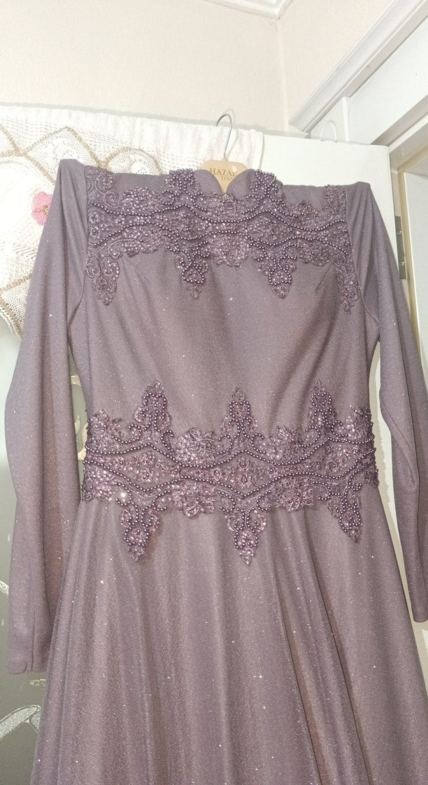 Bu uzun mor abiye elbise, tekne yaka ve uzun kolludur. Drapeli ve işlemeli detaylarıyla klasik ve zarif bir görünüm sunar, düğünler için uygundur. ✨40 beden bir kere tek giyildi hiç bir defosu yok simli uzun kolları detaylı işlemelidir fiyatı da makuldur