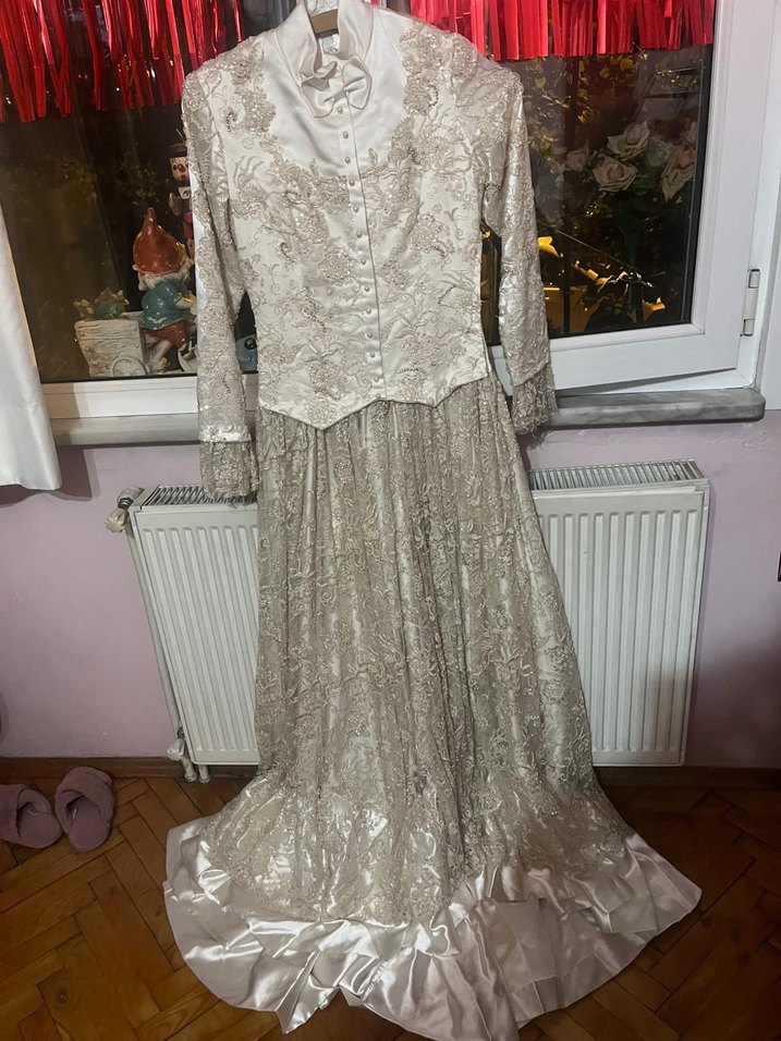 Uzun kollu, özel dikim , drapeli detaylara sahip beyaz nişan elbisesi veya gelinlik olarak kullanabilirsiniz. Helen kesimi ve parlak kumaşıyla klasik ve vintage tarzı yansıtıyor.