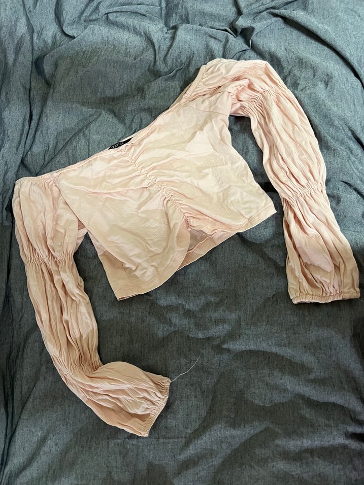 Bej keten bluz, drapeli uzun kollu ve straplez yakalı, rahat kesimli ve midi boyda, konforlu sokak stili için uygun.