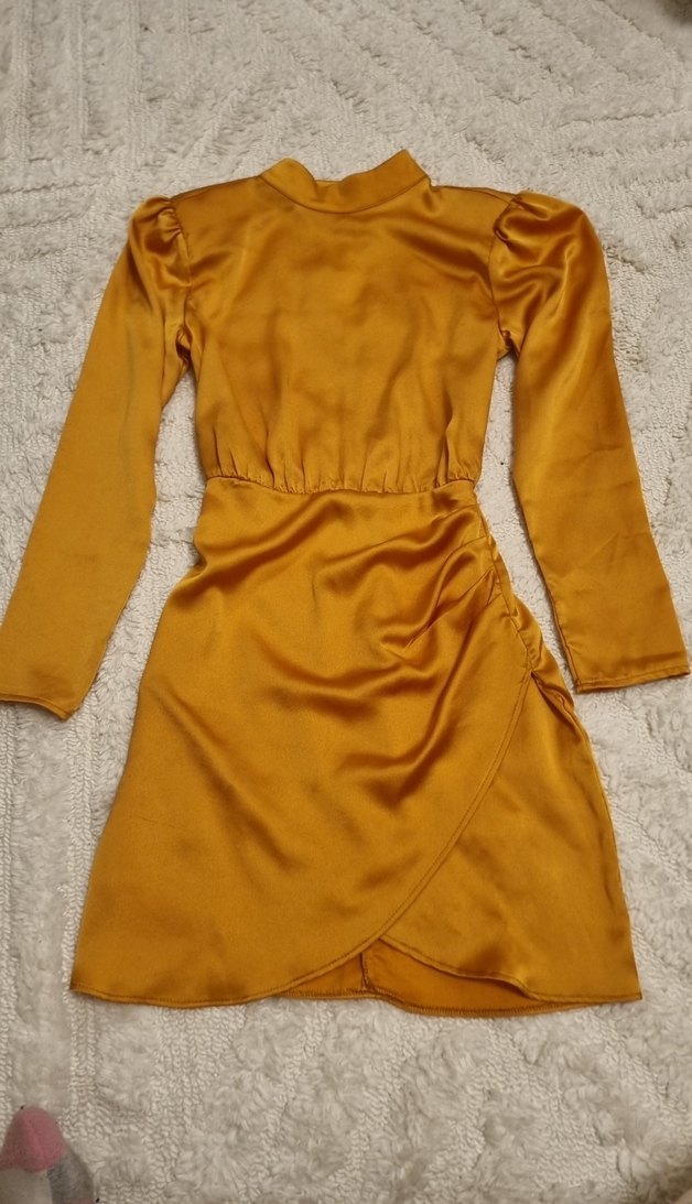 Drapeli tasarımı, uzun kollu ve yüksek yakalı bu sarı midi elbise, bohem tarzıyla romantik akşamlar için uygundur. Vatkalıdır. Ufak tefek sorunları fotoğraflarda gösterilmiştir.