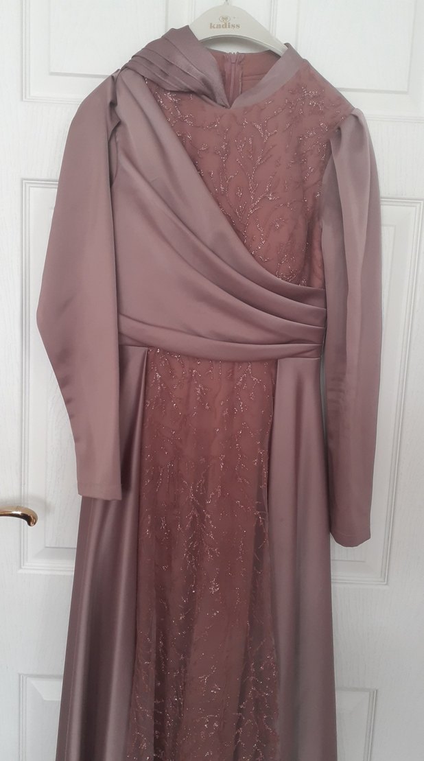 Drapeli detaylara ve V yaka tasarıma sahip uzun kollu bej abiye elbise, modern klasik ve şık bir kesim sunar. Düğünler için uygundur ve pürüzsüz dokusu ile göz alıcıdır. ✨