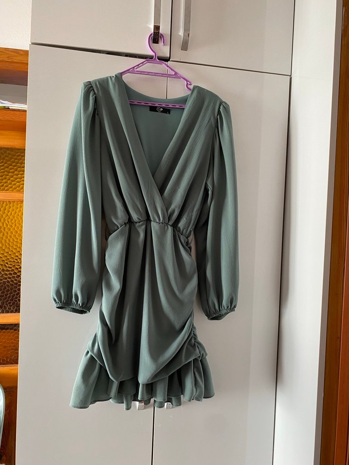 Drapeli ve V yakalı, uzun kollu yeşil uzun elbise. Modern klasik tarzda, romantik buluşmalar için uygun.