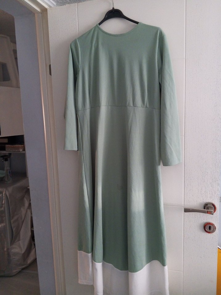 Yeşil renkli, drapeli uzun kadın elbisesi, bol kesim ve yuvarlak yakaya sahiptir. Yumuşak sentetik kumaştan, uzun kollu ve minimal tasarımlıdır. Günlük kullanıma uygundur.