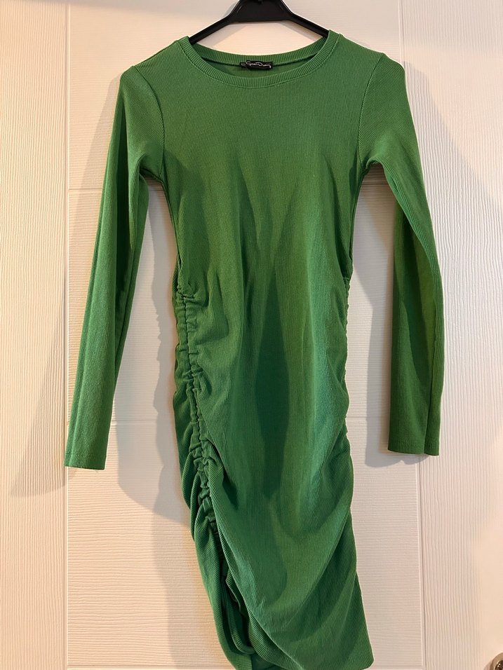Yeşil renkli, uzun kollu, kruvaze yaka ve yan tarafında drapeli detay bulunan, sentetik yumuşak kumaştan yapılmış midi triko elbise.