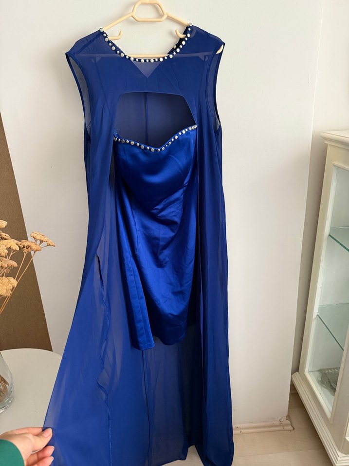 Kolsuz, v yaka ve drapeli uzun lacivert abiye elbise, parlak kumaşla düğün ve çağdaş stil için uygundur. Üzerinde şifon pekerini mevcuttur. Ayrı giyiliyor✨