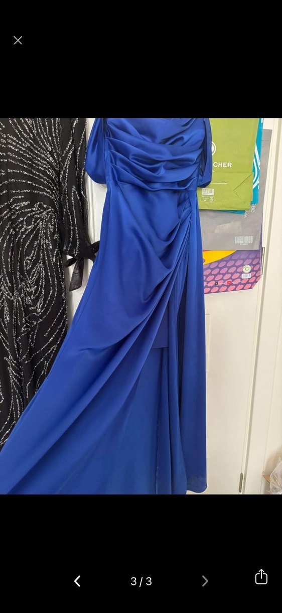 Drapeli ve tekne yaka, uzun kollu olmayan lacivert abiye elbise. Regular kesim, baskılı desenli, düğünler için uygun. CHER markalı.