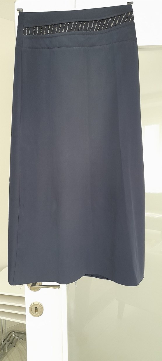 Drapeli ve ipeksi dokulu uzun lacivert etek, normal kesim ve minimalist normcore tarzıyla ofis kullanımı için uygundur.