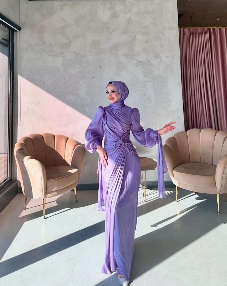 KİRALIK Drapeli Uzun Lila Abiye Elbise SATILIK