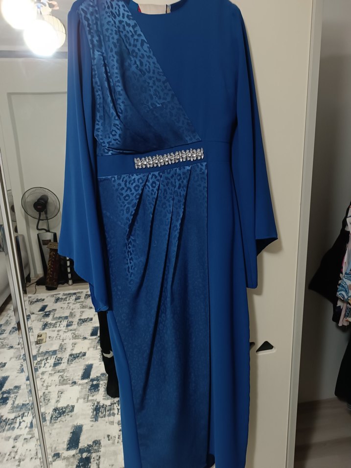 Drapeli desenli, uzun mavi abiye elbise, uzun kollu ve kayık yaka detaylıdır. Düzenli kesim ve kemer süslemelidir, düğünler için uygundur. 42-44 beden için uygundur