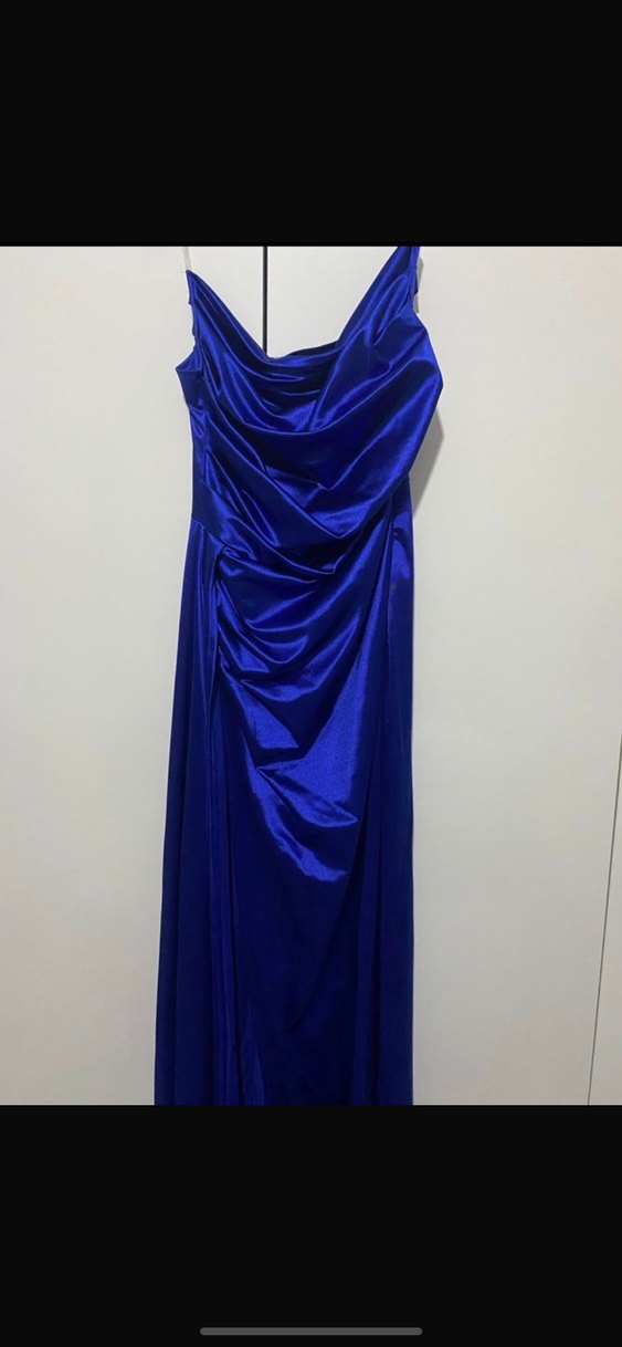Drapeli, uzun ve straplez kesime sahip bu mavi parıltılı abiye elbise, klasik ve şık bir görünüm sunar.