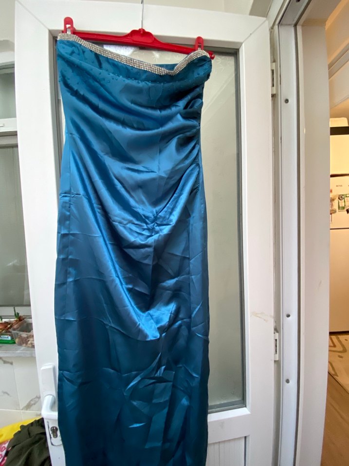 Uzun, straplez ve kolsuz bu abiye elbise, drapeli tasarımı ve parlak mavi kumaşıyla parti için uygundur. Minimalist ve bohem tarzda, avant-garde dokunuşu vardır.