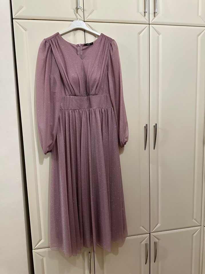 Diger marka, V yaka ve uzun kollu, drapeli detaylı, uzun mor abiye elbise. Rahat kesimi ve pastel tonuyla düğünler için uygun klasik vintage tarzı sunar.