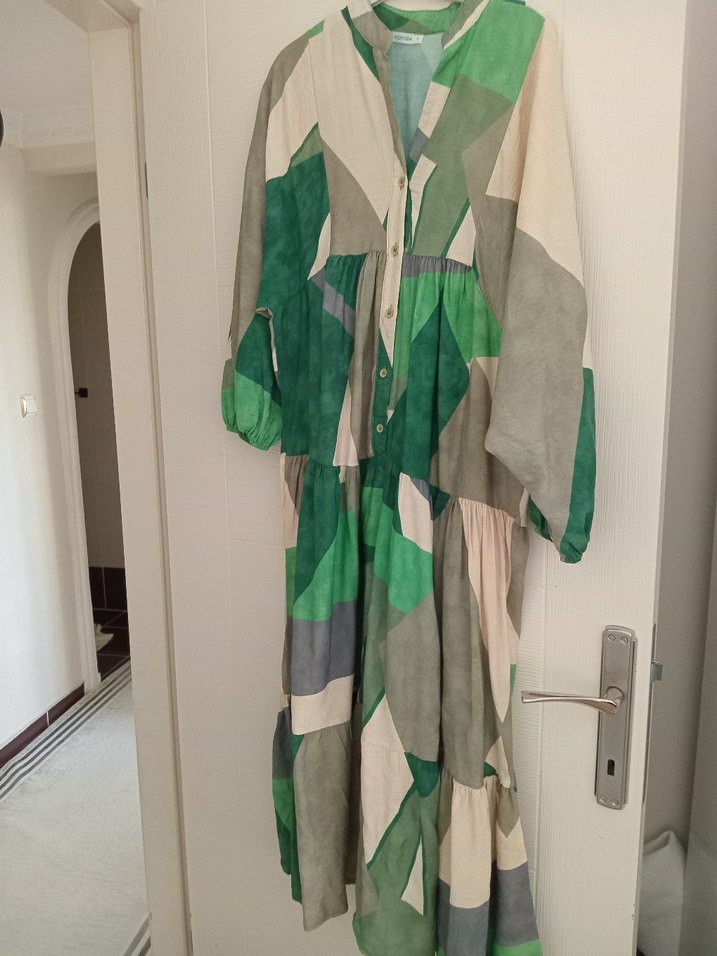Diger markasının uzun ve salaş kesim kadın elbisesi, yeşil ve gri tie-dye desenli. Uzun kollu, yakalı ve drapeli tasarıma sahip, günlük kullanıma uygun. 36 38 bedene uyumlu salas model 1 kez giyildi sadece