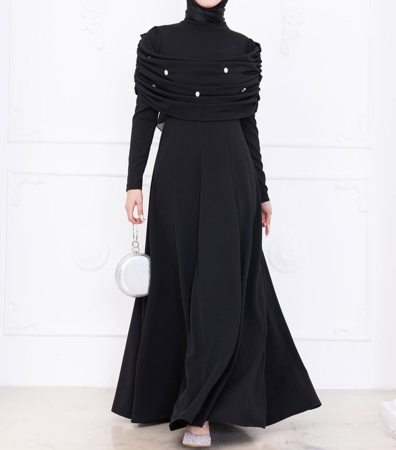 ürün hiç giyilmedi Uzun siyah elbise, yüksek yakalı ve uzun kollu, drapeli tasarımı küçük taşlarla süslenmiş, çağdaş ve şık bir görünüm sunar. Düzenli kesim ve desensiz kumaş, klasik zarafete avangart bir dokunuş katıyor.