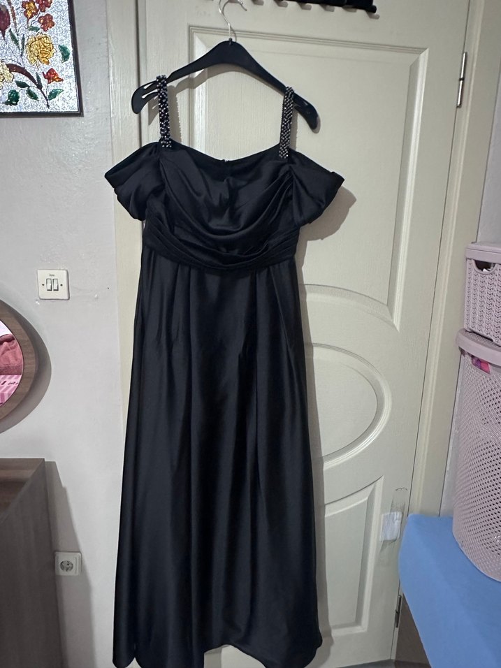 Siyah, straplez ve drapeli uzun elbise, ince kesimi ve askılı kollarıyla gotik şıklık sunar. Romantik akşamlar için uygundur. Bu elbiseler bir kez giyildi dolapta durmasının anlamı yok bu kadar uygun kaliteli asla bulamazsınız