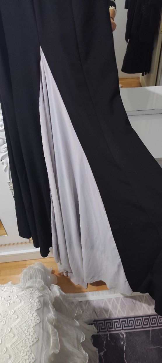 Drapeli uzun siyah ve gri tonlarında, sentetik kumaştan yapılmış, regular fit hamile eteği. Avant-garde ve goth tarzına uygun, düğünlerde kullanılabilir.