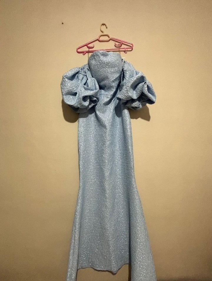 Uzun, straplez mavi kadın elbisesi drapeli ve hacimli kollara sahip. Düzenli kesim ve desensiz tasarımıyla günlük kullanım için avant-garde dokunuş sunar.