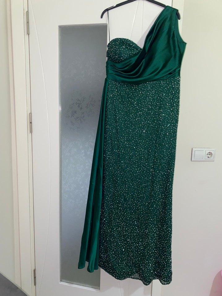 Drape yakalı, uzun ve yeşil parlak renkte, klasik modern tarzda abiye elbise sadece 1 kere giyildi kusuru veya deformesi yoktur 42 44 beden arası rahatlıkla kullanabilir