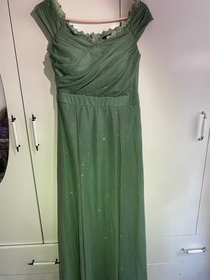Drapeli, tek renk parlak simli yeşil uzun abiye elbise, tekne yaka ve kolsuz, klasik ve şık bir görünüm sağlar. Hiç bir kusuru yoktur